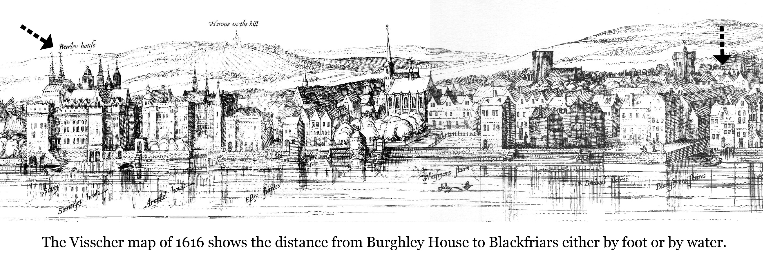 He would certainly have been familiar with the warren of apartments and studios at Blackfriars from his earliest days at Cecil House.  When preparing for some important Court event, he and Rutland would have learned their dance routines  from the Court dancemaster, Richard Frith, who, from 1554 until 1589, held the lease on the apartment next to the one that, according to Irwin Smith, later became the first Blackfriars Theater (134).  Most likely Oxford and Rutland also studied fencing with William Joyner, the fencing master whose studio occupied rooms on the floor directly beneath the theater apartment (125-6).  Later, once Oxford was living at Court and helping to produce Court entertainments, these rooms would have been the ones he used for rehearsals, with costumes and props coming from the apartment next door.