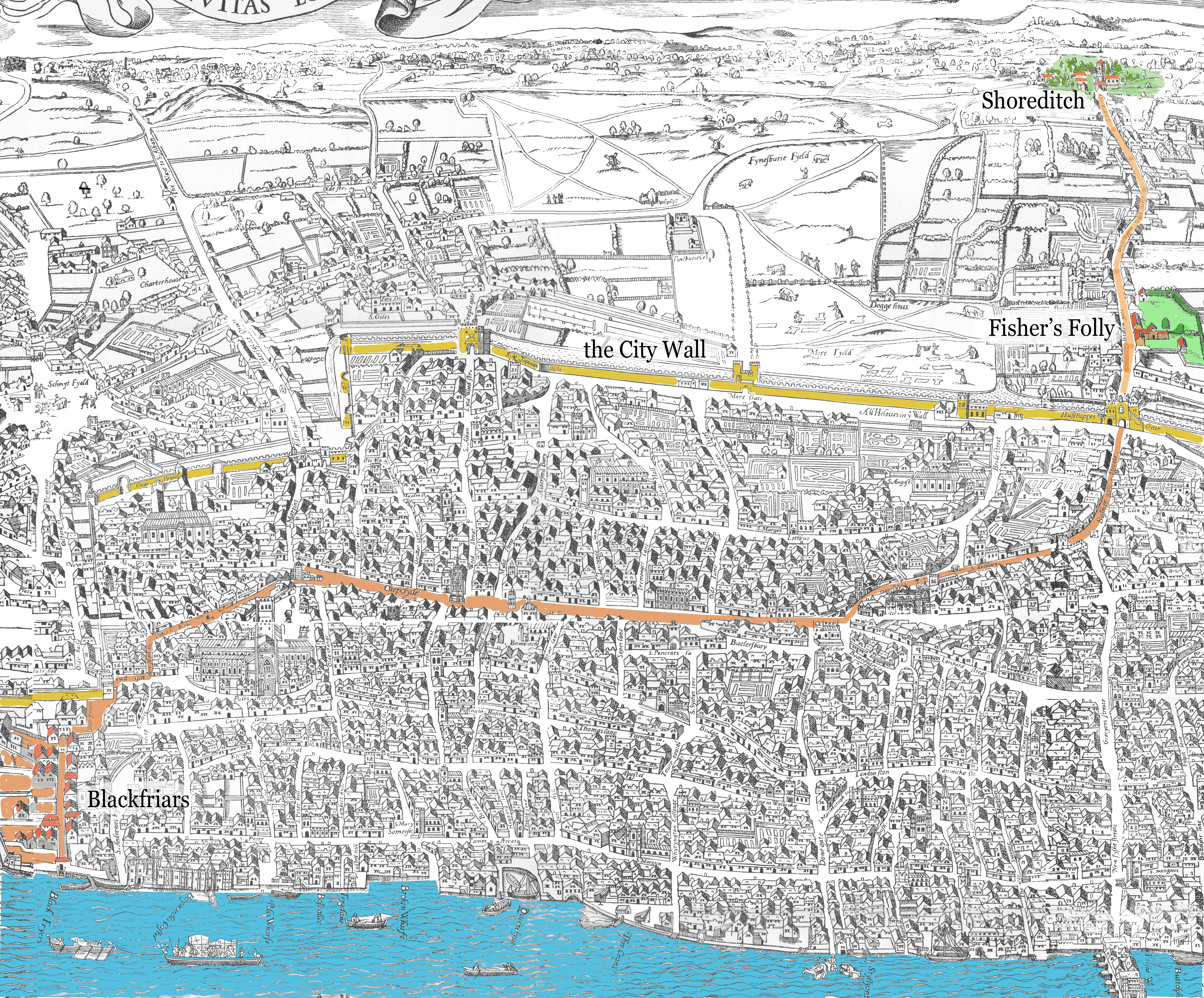 Yellow traces the City Wall, the boundary of Central London; brown shows the most direct and heavily travelled path between these two theaters with Oxford’s Folly in between. Only the most important buildings on this map are to be taken seriously. Since the map was created during the 1560s, neither of the theaters are shown, only the districts where they were created in 1576.