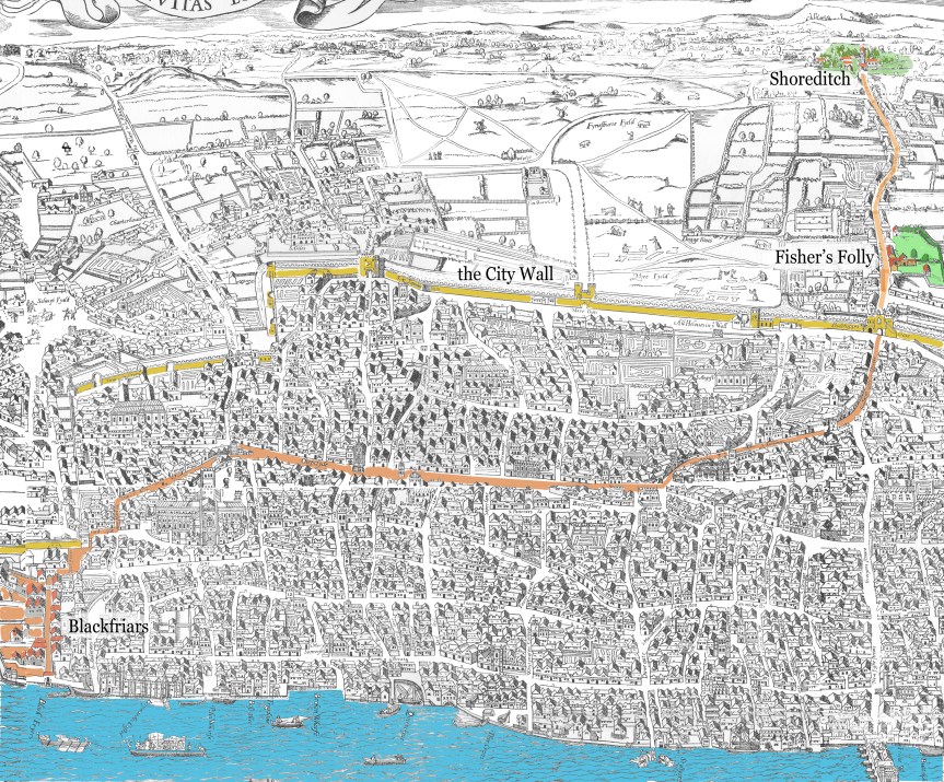 This section of the Agas map of the mid 1560s has been colored to show the location of Fisher’s Folly, Oxford’s headquarters from 1580 to 1588, vis a vis Blackfriars on the Thames, where he first performed plays for the West End community (to the immediate left, not shown here), and Shoreditch, to the north along the Bishopsgate road, where Burbage built the first round wooden yearround successful commercial stage in 1576. The distance from Shoreditch to Blackfriars was roughly a mile.