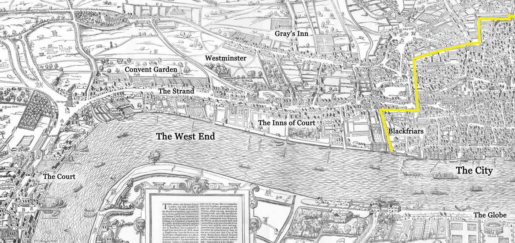 Outraged at his banishment from Court and by the way he and his men were being threatened by his lover’s relatives as Elizabeth sat by and did nothing, Oxford wrote nothing for the Court for the two years that he was ostracized (1581-’83), turning instead to his favorite audience, the “gentlemen of the Inns of Court.” For them he could unfurl the full power of his rhetoric on the kind of issues that would never have passed the Court censors. The West End (more accurately the city of Westminster) was where the legal colleges, the Inns of Court, were located. Further west, between the Strand and the Thames, stood the great City mansions where the most prestigious courtiers and government officials lived.